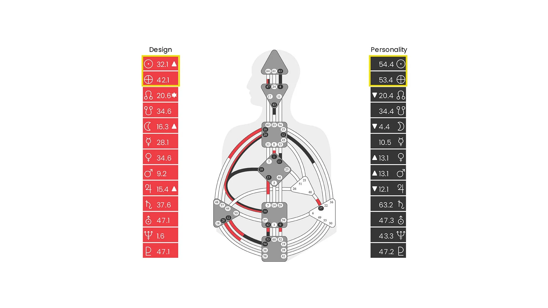 Note: Every Human Design chart is more than the sum of its parts, and every element of a chart affects — and is affected by — every other element. Human Design is a deeply layered, complex system that integrates eastern and western traditions and wisdom. When I share discrete elements of a chart, I am simply sharing glimpses into the mechanics of Human Design (and the Gene Keys) to show others how they, too, can discern practical insights from their own charts into their uniqueness and the patterns of thought, behavior, conditioning, emotions, and psychology that keep them from achieving their highest potential or living their best life.