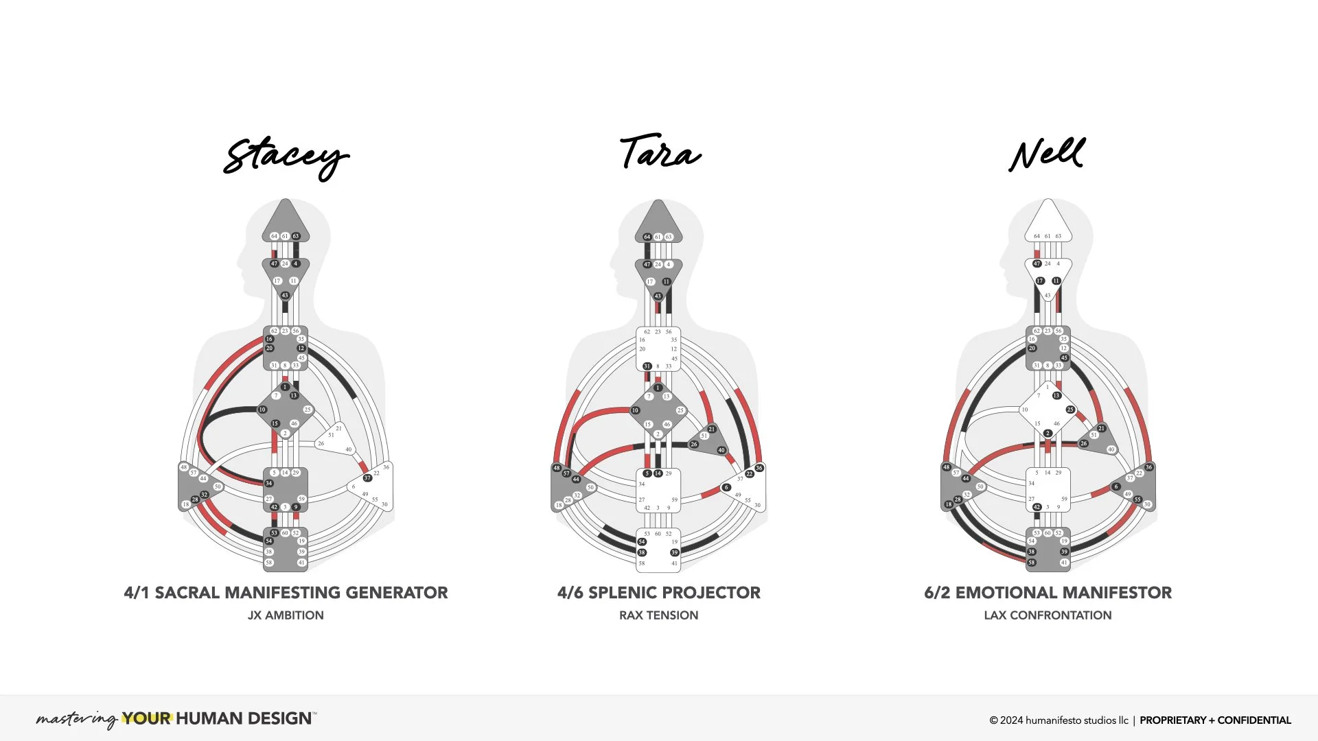 Between the three of us we have three different energy types, three different inner authorities, all three angles (Right, Left, and Juxtaposition), all energy centers defined, 19 of the 36 life force channels (between natal + electromagnetics), all the major circuits (Individual, Collective, Tribal), and all the minor circuits (except Tribal-Defense).